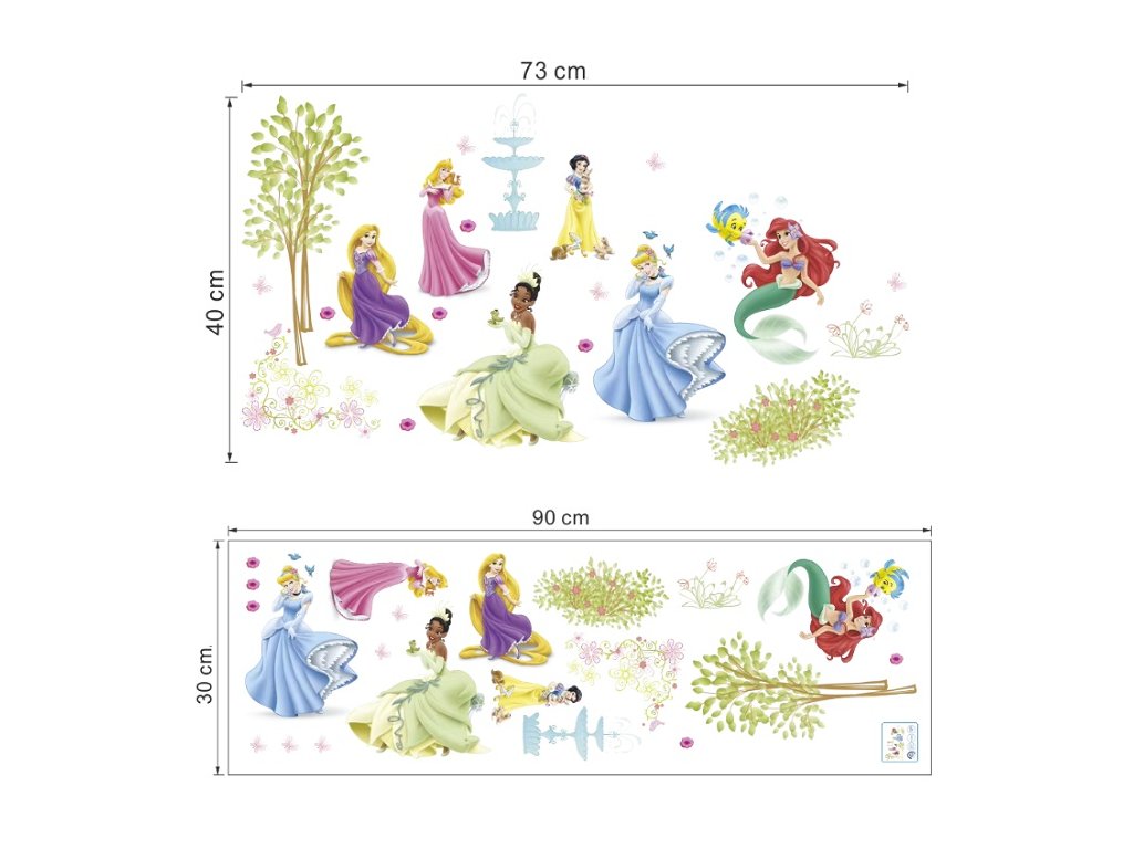 Krásné pohádkové princezny v kouzelných šatech na jedné okouzlující 3D samolepce. Půvabná nálepka obsahující Popelku, Šípkovou Růženku, mořskou pannu Ariel, princeznu Bellu, Jasmínu a Sněhurku.