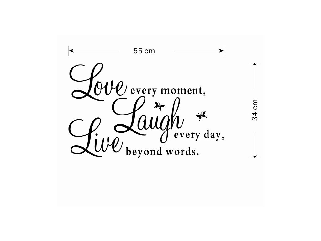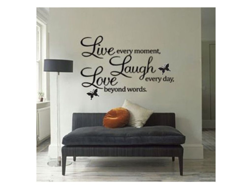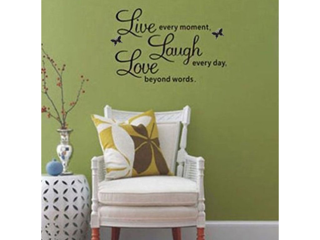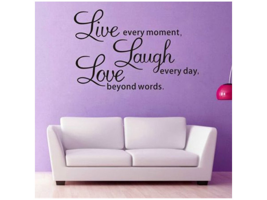 Nálepka na zeď Live, Laugh, Love se dá použít na jakýkoli rovný povrch: stěna, zrcadlo, nábytek, okno apod. Je samolepící, voděodolná, nezanechává šmouhy po odlepení.