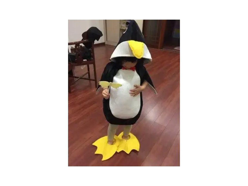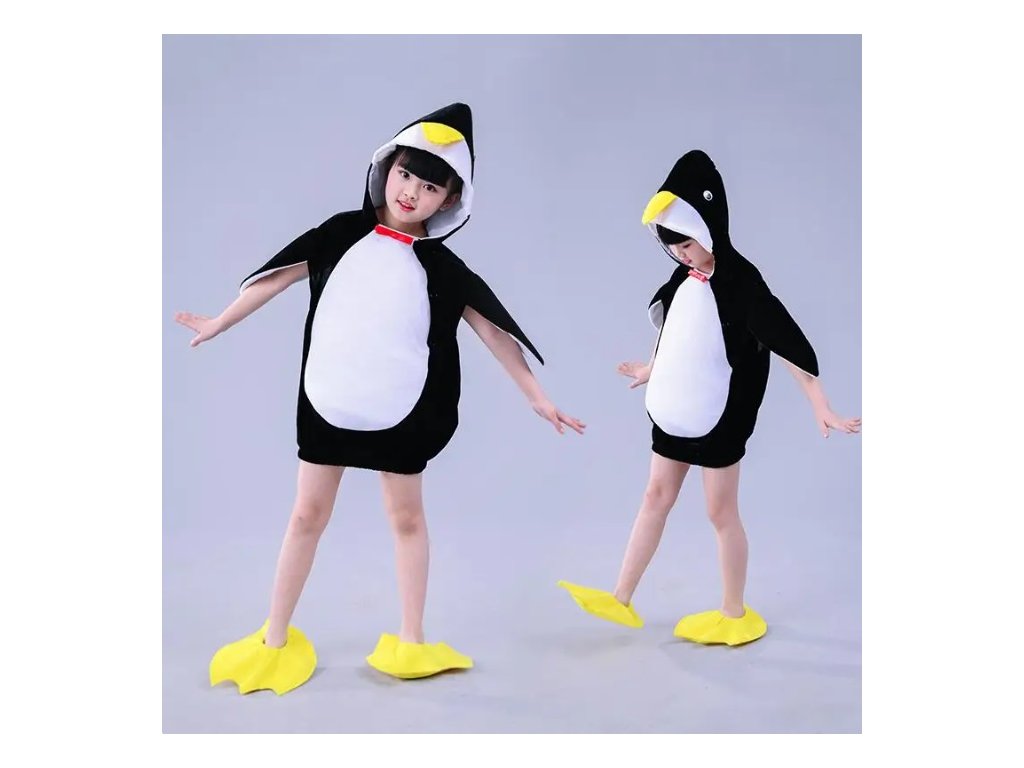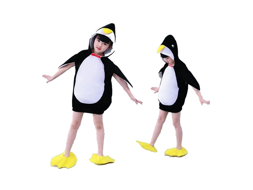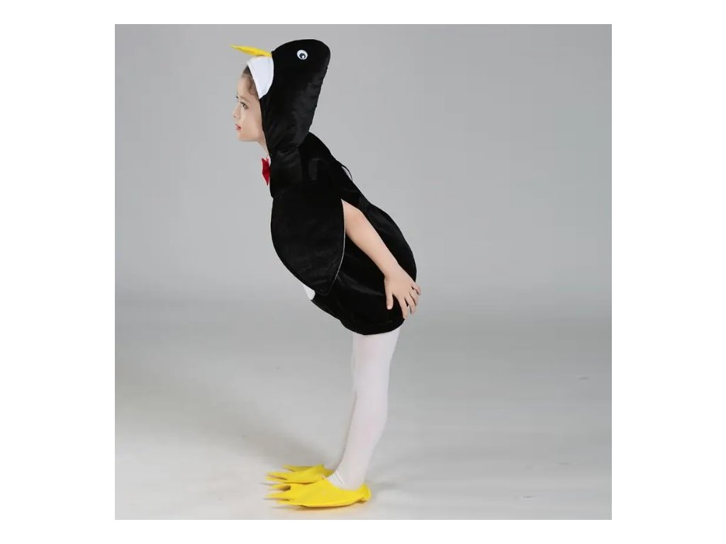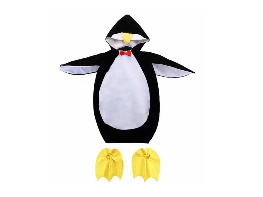 Balení obsahuje: tučňákovský oblek s kapucí se zobáčkem a očky, motýlek a žluté návleky na nohy