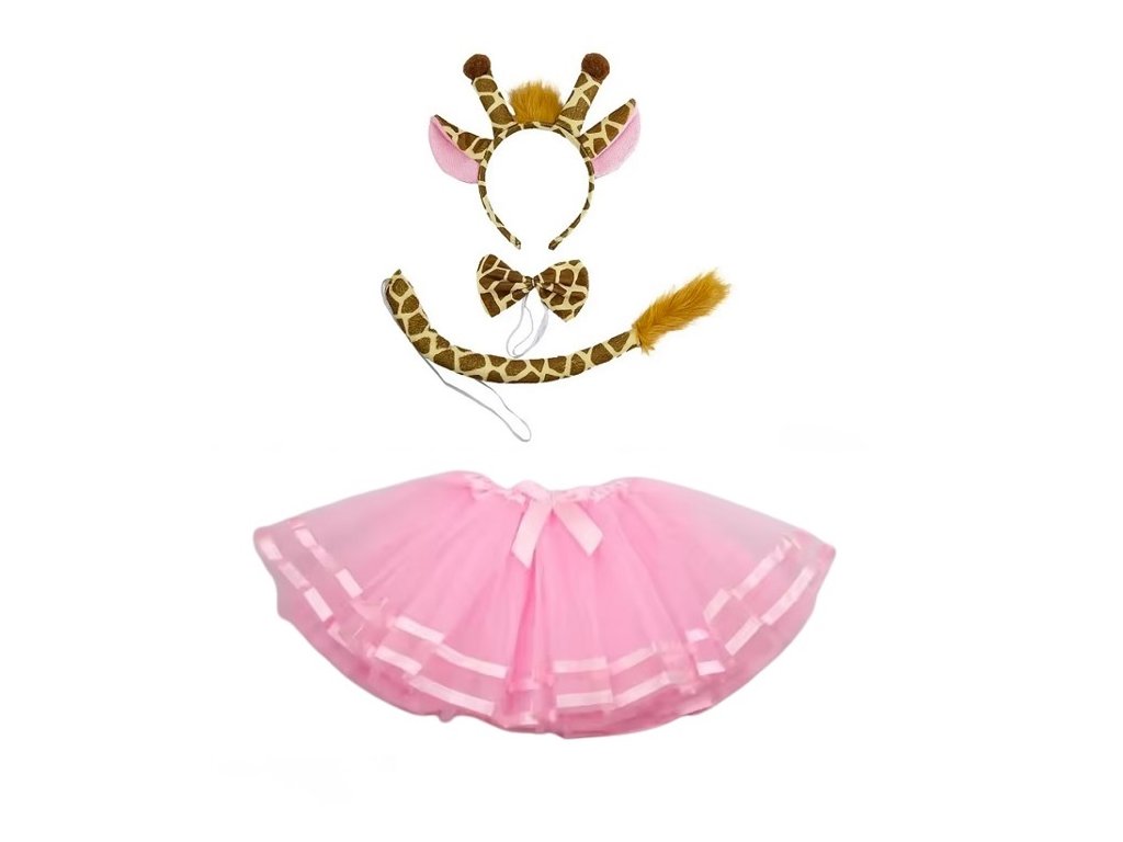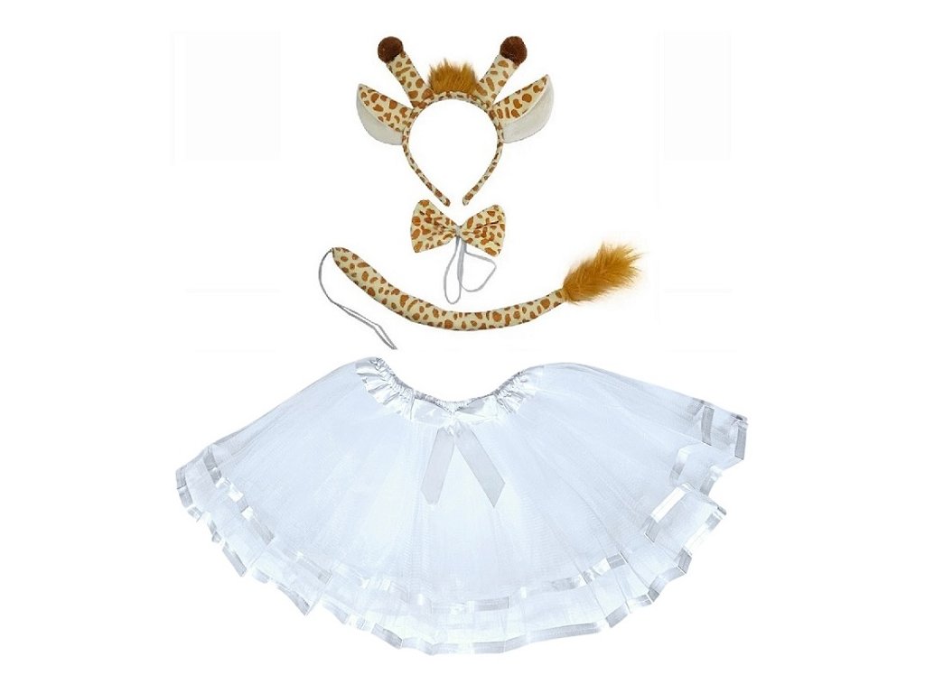 Kostým obsahuje: čelenka s oušky, motýlek a ocas s žirafím vzorem