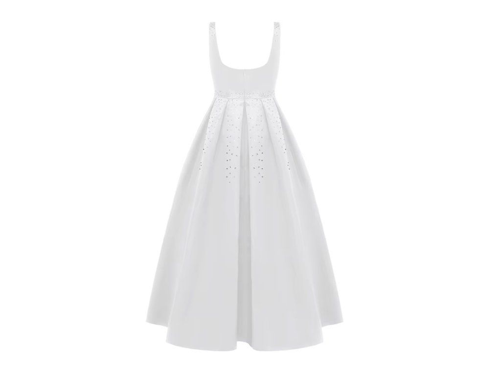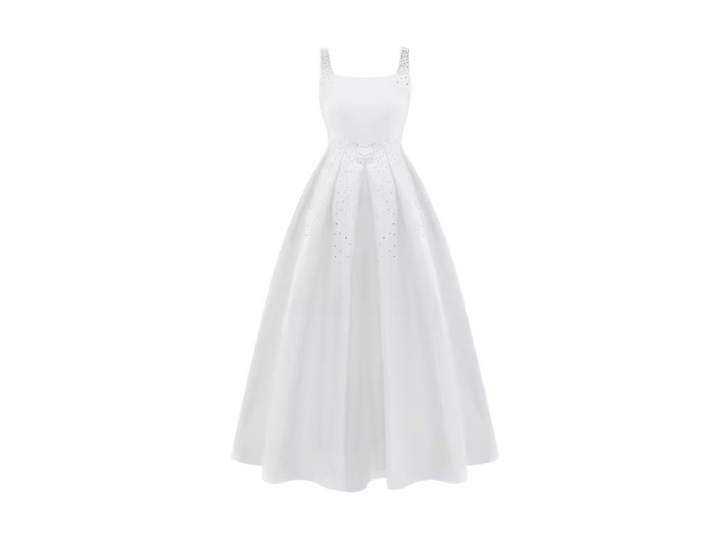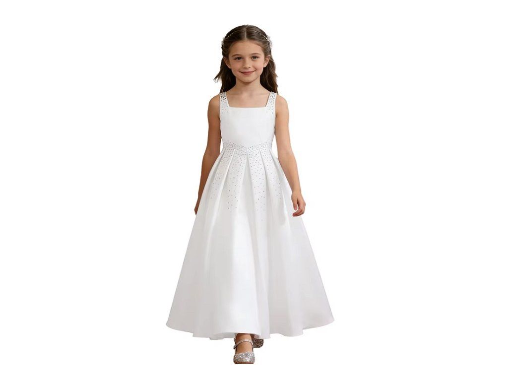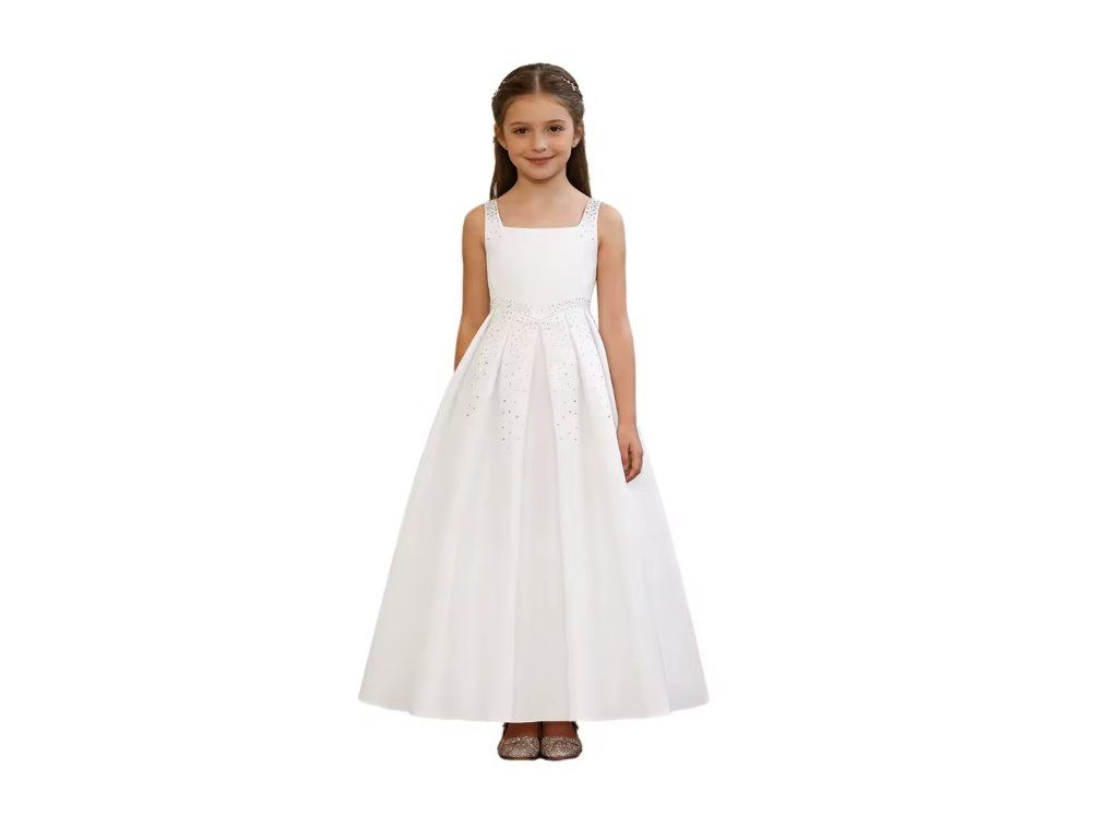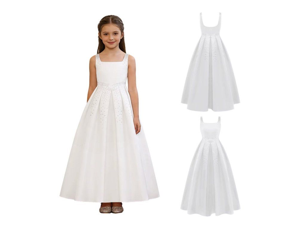 Bílé společenské šaty pro malé slečny. Šaty jsou vhodné pro 1. svaté přijímání, pro svatbu pro družičku, nebo pro jiné společenské události. Šaty jsou zdobeny stříbrnými kamínky a zapínají se na zádech zipem.