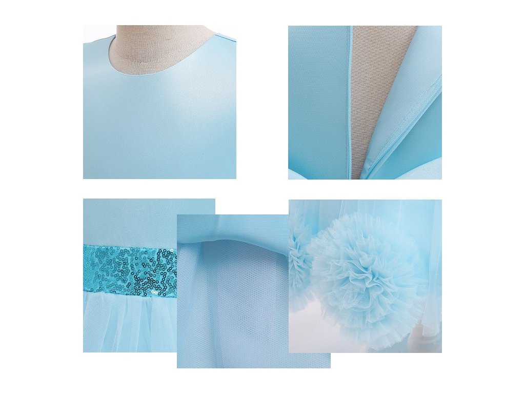 Sukně na šatech má 2 vrchní tylové vrstvy, 1 saténovou vrstvu a látkovou spodničku. Zapínání šatů je na zádech zipem a přiložena je velká mašle na připnutí.