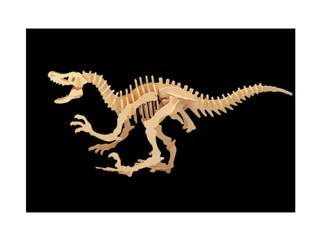 Dřevěná kostra velociraptora. Věděli jste, že velociraptoři měli původně peří? Ne? Nevadí, já také ne, dokud jsem nepsal tento popisek.