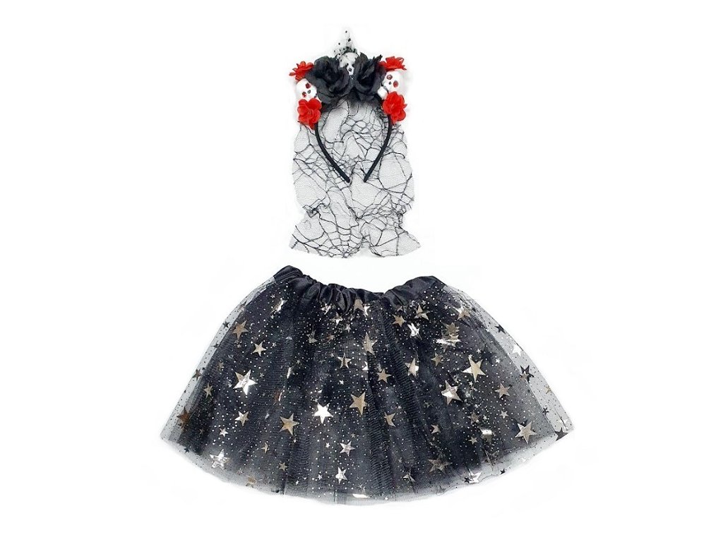 Kostým obsahuje: černou sukni se stříbrnými hvězdičkami a čelenku s lebkami a růžemi se závojem