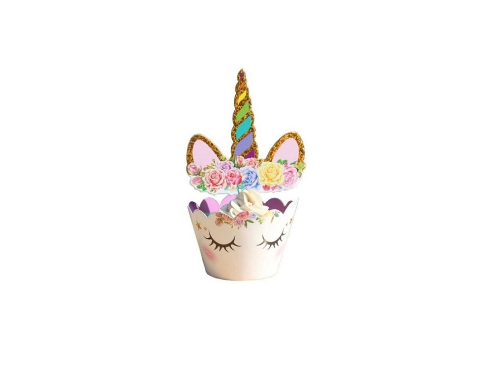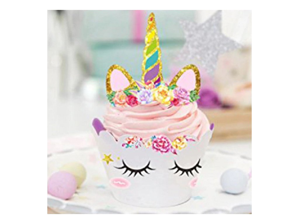 Skladové číslo 3500o: Cupcake papírové: 6 ks cupcake (délka 22 cm šířka 5 cm) + 6ks zapichovatko s duhovým rohem a oušky 8,5 cm x 12,5 cm